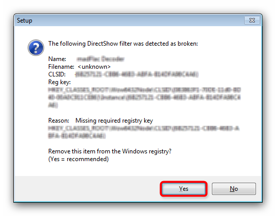 If during installation you get an error that says "The following DirectShow filter was detected as broken", click Yes to have K-Lite remove the erroneous registry entry. See example to the right, below.