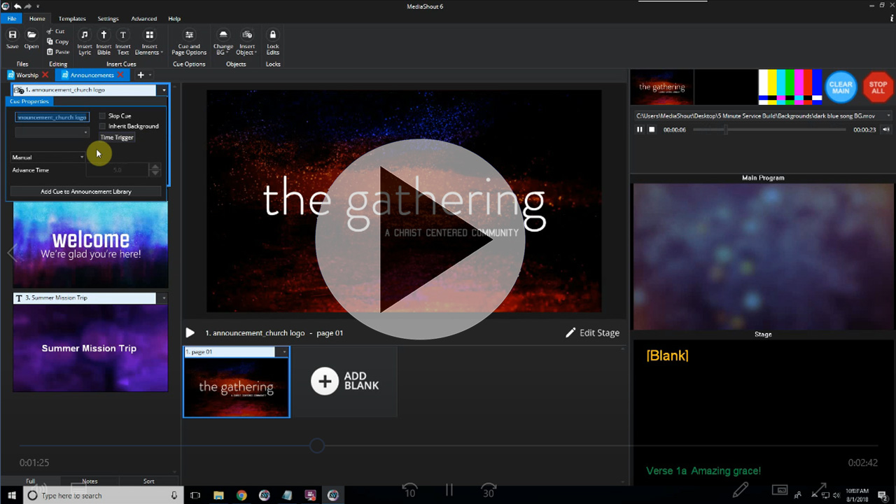 2) Add your announcement cues to the script. This can be media files like pictures that you drag in from a folder on your computer, text cues that you create in MediaShout, etc.