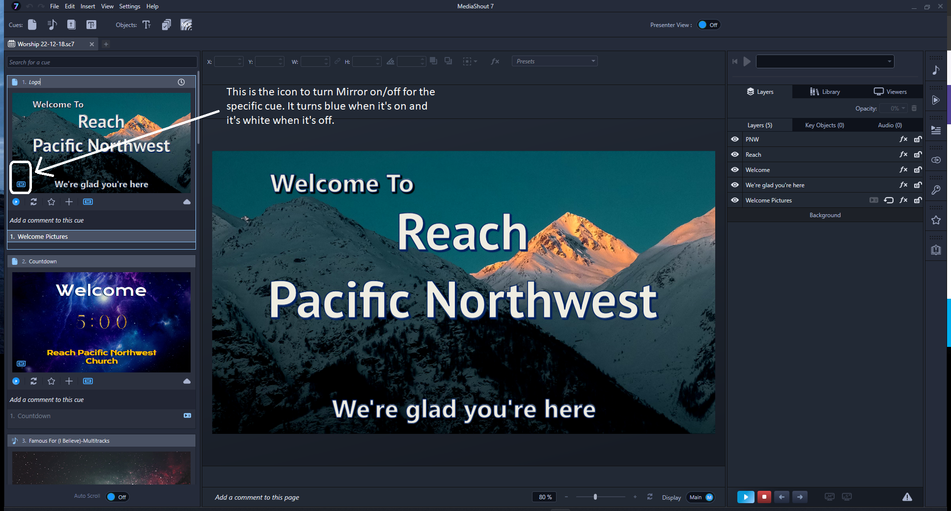We are using the stage display for streaming and lower third lyrics with a green background. Our MS operator always has to switch Mirror Main to No when the song begins and then switch it to Yes when the songs end. In our case, lyric cues always should have Mirror Main = No for the streaming video. We must also be careful to coordinate the Mirror Main switching with our video producer to avoid black or green screen Program video on the stream. Having Mirror Main saved with lyric cues would improve our streaming quality and sooth the nerves of the volunteers.