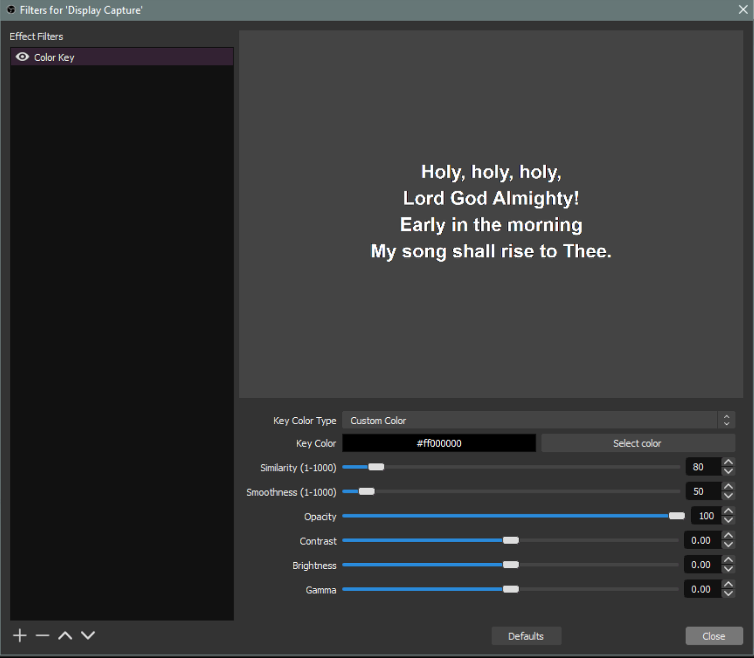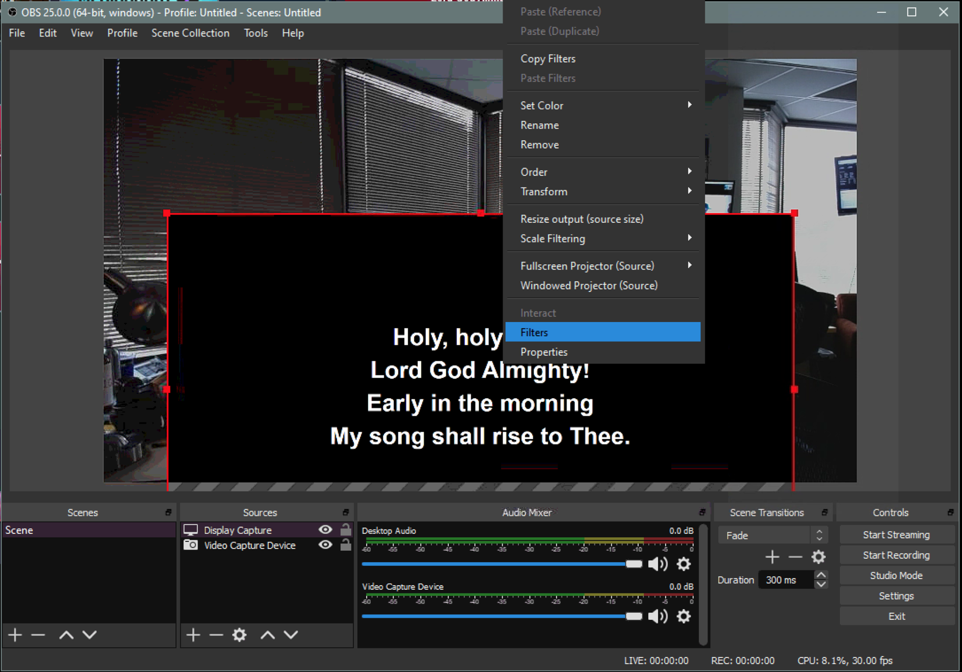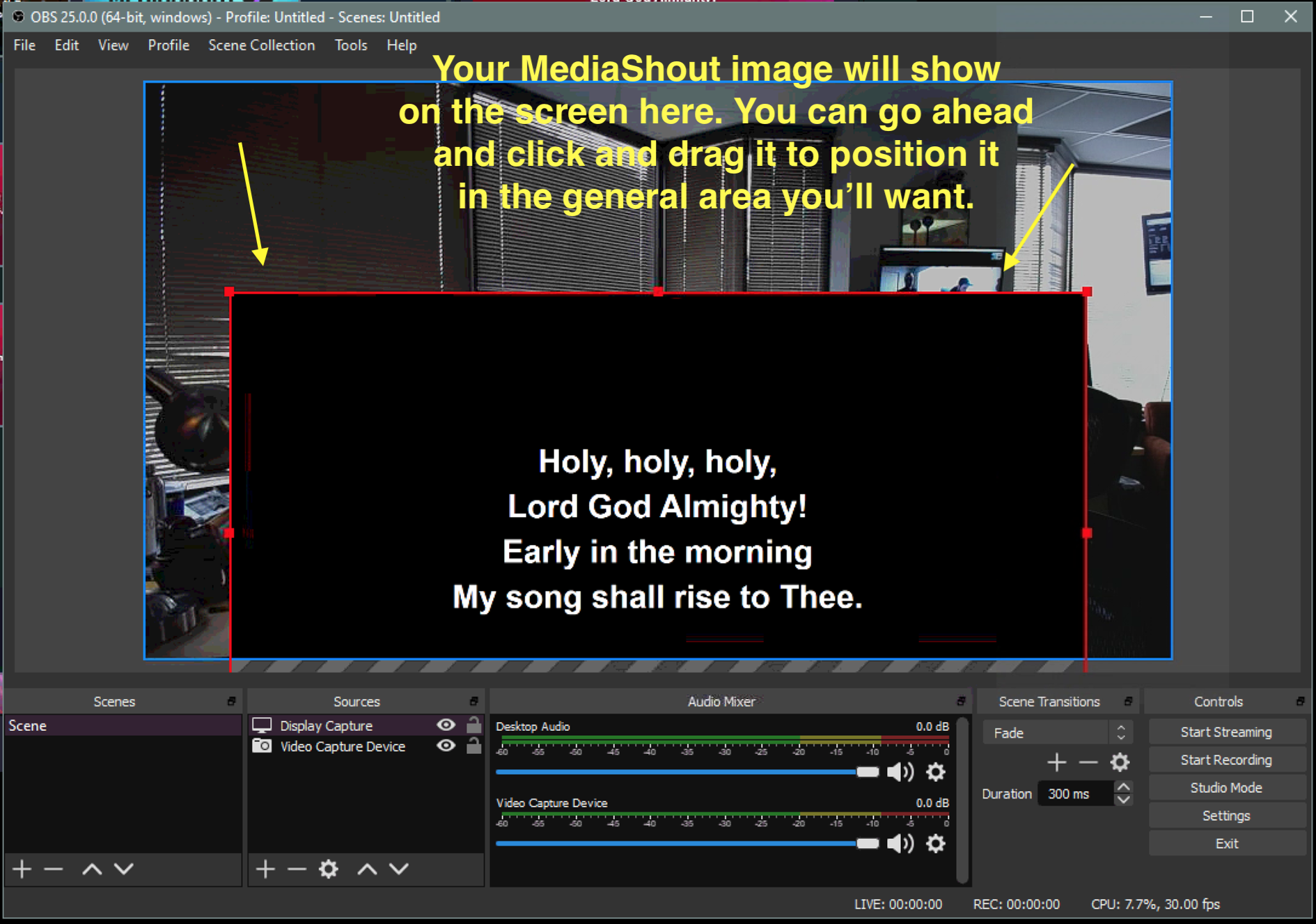 Please Note: Running this combination of software on a computer can cause heavy use of system resources, so be sure that you test it and are comfortable with the performance of your system before going live. With adequate hardware, however, this can be a great solution to get a simple live stream up for your church and have the ability to present lyrics or scriptures overlaid on top of the stream directly to Facebook Live or Youtube. Also, while this setup can work well in many situations, we do not officially endorse OBS or have the expertise to provide support for their software. For any further detail than what is provided in this article, please reach out to the OBS community or online tutorials (not MediaShout Support).
