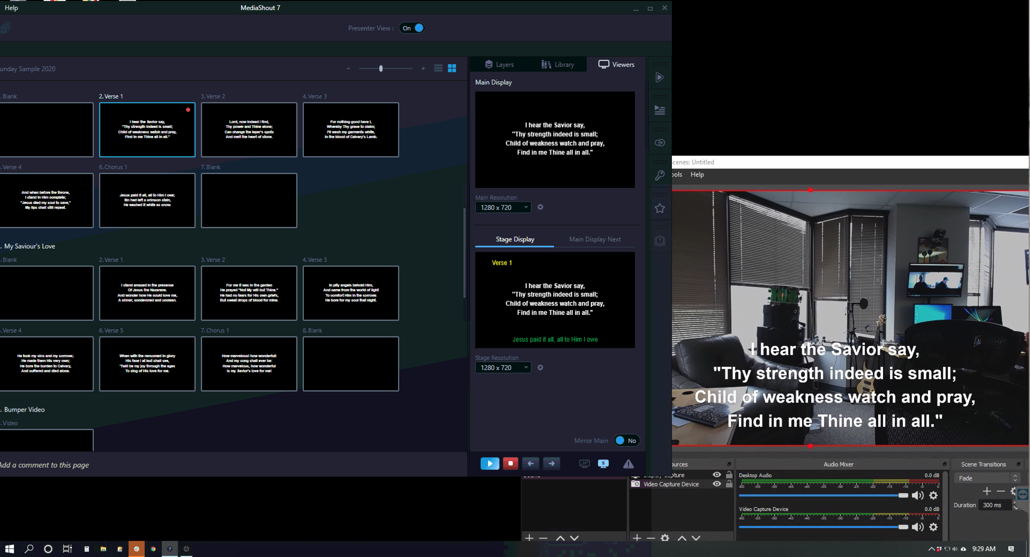 Because MediaShout software integrates with a wide range of media files and hardware, we often are asked about streaming options by our customers. And while our software can certainly play a major role in a live streaming system, there are several technologies involved in streaming which we do not have expertise in, and which are required when an organization is considering streaming live events. With the rapid growth of interest in live streaming church services and other events which has been propelled by the response to Coronavirus (COVID-19), we have prepared this article to help explain some of the ways which you may be able to use MediaShout with a popular streaming tool called OBS, and we also recommend a partner of ours — BoxCast — who offer a simple and popular streaming service which can be a very quick and easy way to get into streaming without a lot of technical know-how up front.