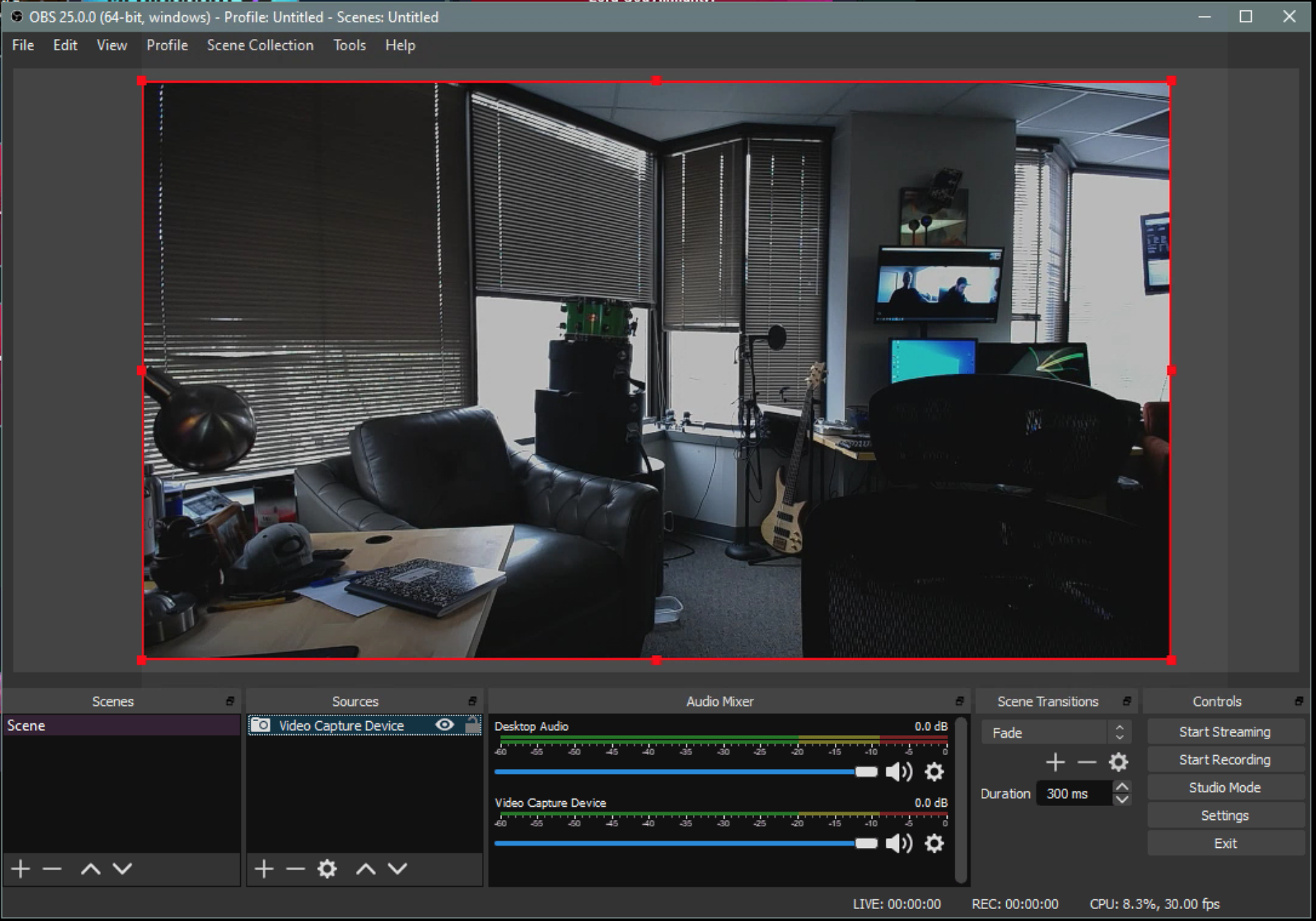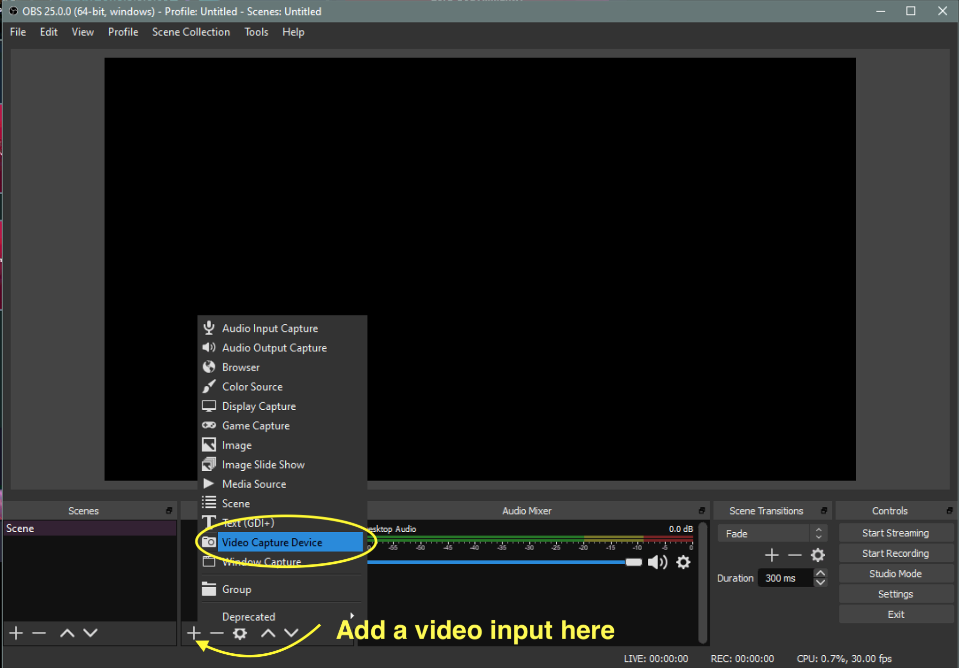 3. After you're done with the settings, you'll get the basic control screen of OBS. At the bottom, hit the + button under Sources to add a video input device. Note that any basic webcam or video input device or feed will automatically appear in the menu. In some situations, you may decide to use a video capture device for your computer. This is an area where you may need to look to an AV professional for assistance if you don't already have this setup or knowledge. (There are too many variables for us to be able to recommend specific hardware or solutions.)