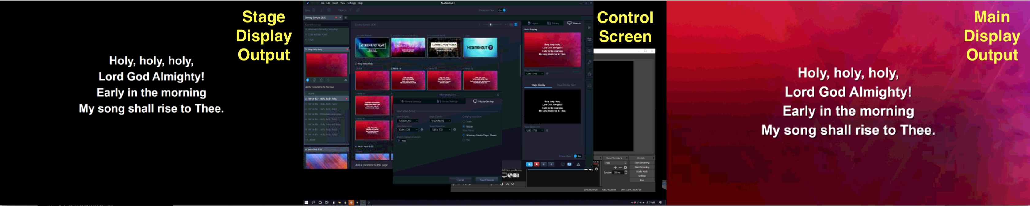 1. Open up MediaShout and get your displays running the way you normally would if you were using a Main Display for the congregation and a Stage Display as a secondary output. While there may be other ways of setting OBS up to receive an input signal, the simplest way we've found is to actually have your external displays connected, so you can piggy-back off one of their outputs. If you were looking at all three screen outputs, it would look something like this (the order of the screens doesn’t matter):