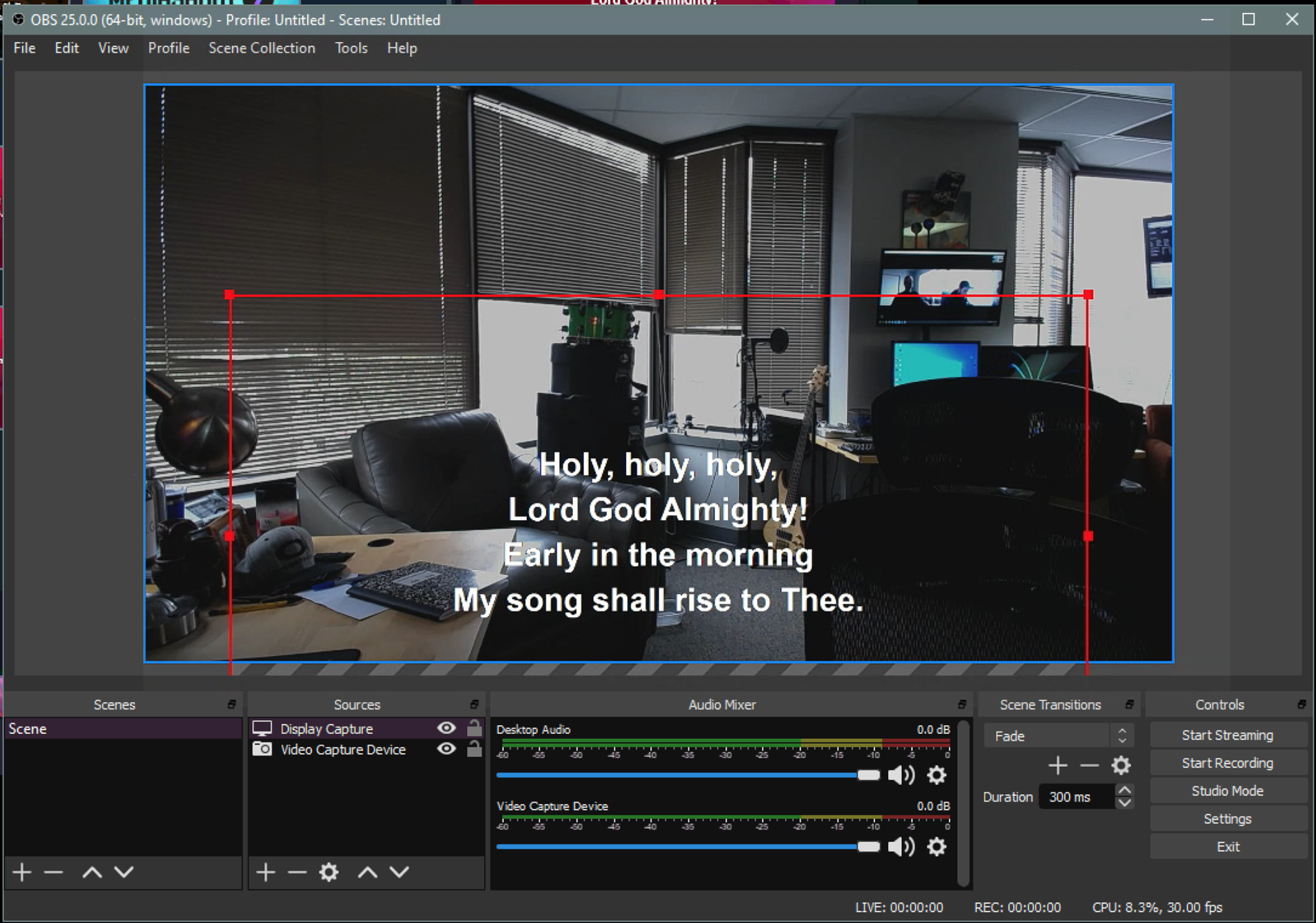 You will now have the words from MediaShout configured to overlay your video feed in OBS, and it will look like this: