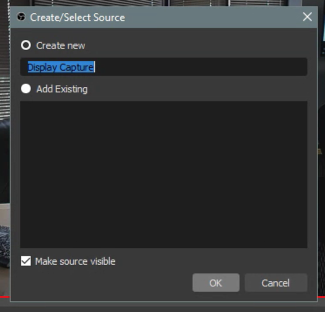 6. OBS will bring up a window for you to choose which Display output to use. Which display you select will be determined by the scenario (1 or 2 above) that you want to configure for.