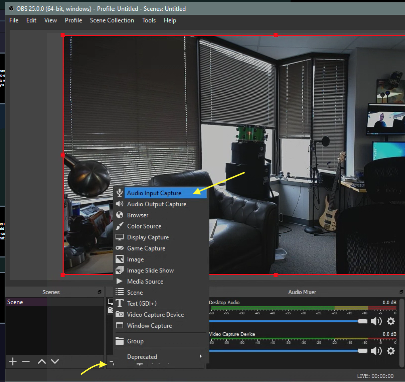 Then use the + button in the Sources to add it and select your audio source. Keep in mind there are many advanced options in OBS if you should need to delay the audio signal to sync with the video, etc..