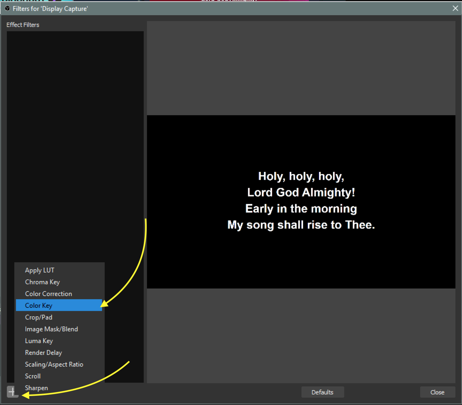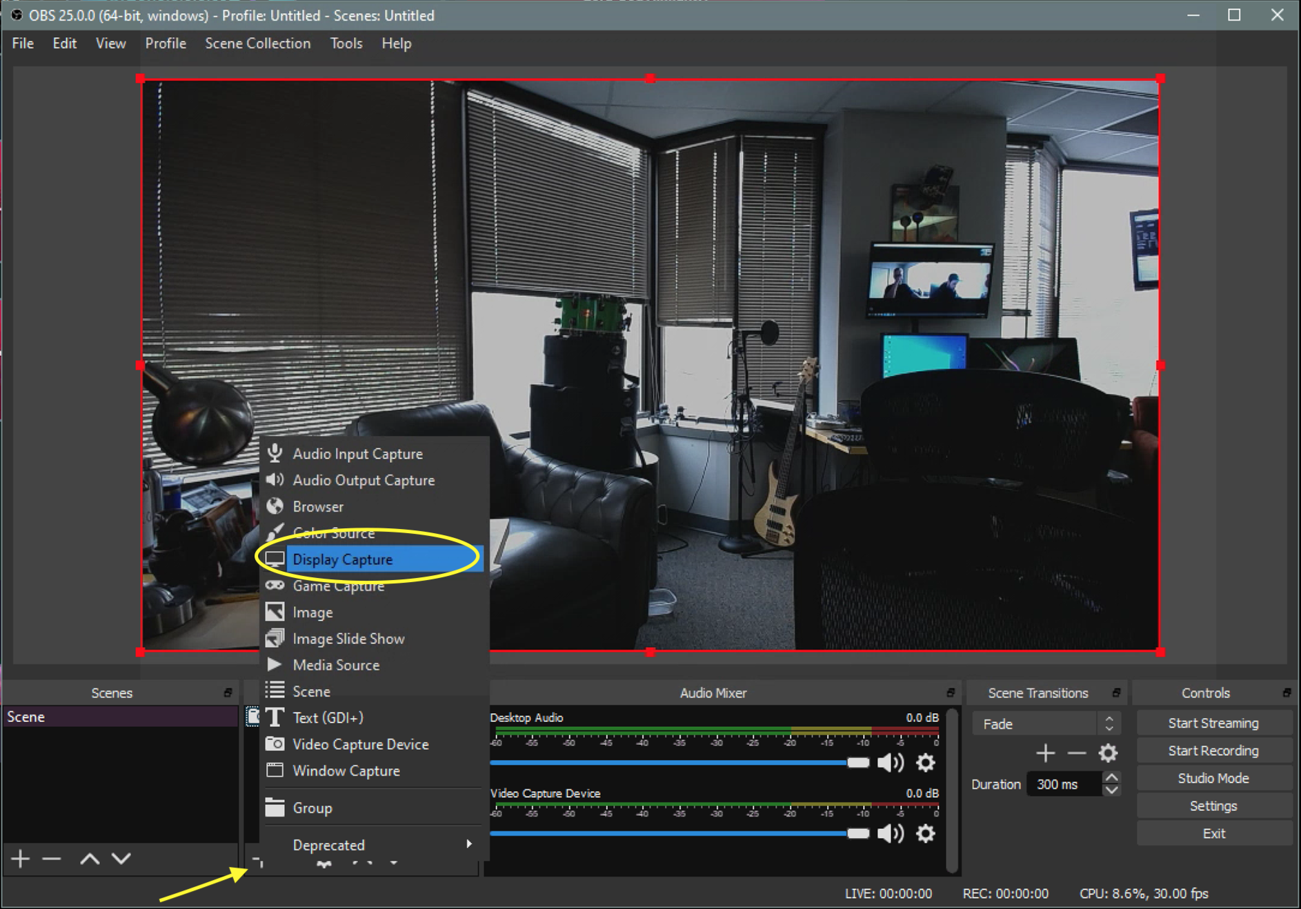 5. Now that your video feed is showing, the next step is to add MediaShout as another layer. Press the + button at the bottom in the Sources box again, and this time select Display Capture.