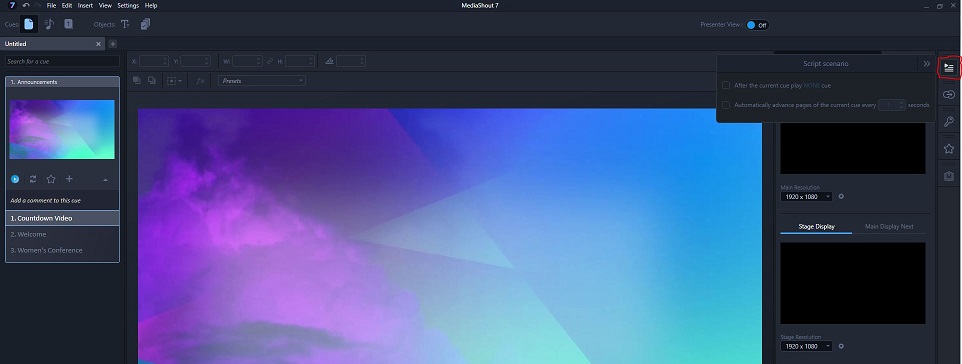 First, select the first Announcement cue on the left side of MediaShout. set your "Advance Time", then, click the Script Control Plug-in on the right side of MediaShout 7.